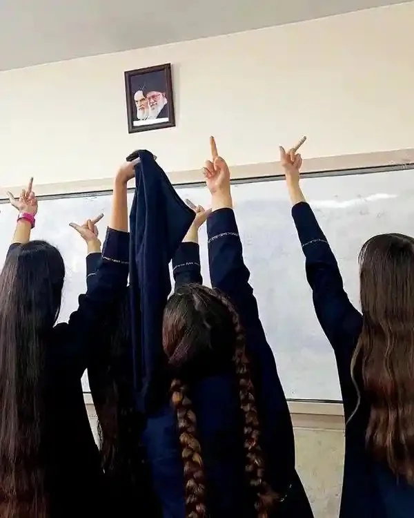 Schoolgirls without mandatory hejab in defiance of the portrait of the Supreme Leaders Khomeini and Khamenei.